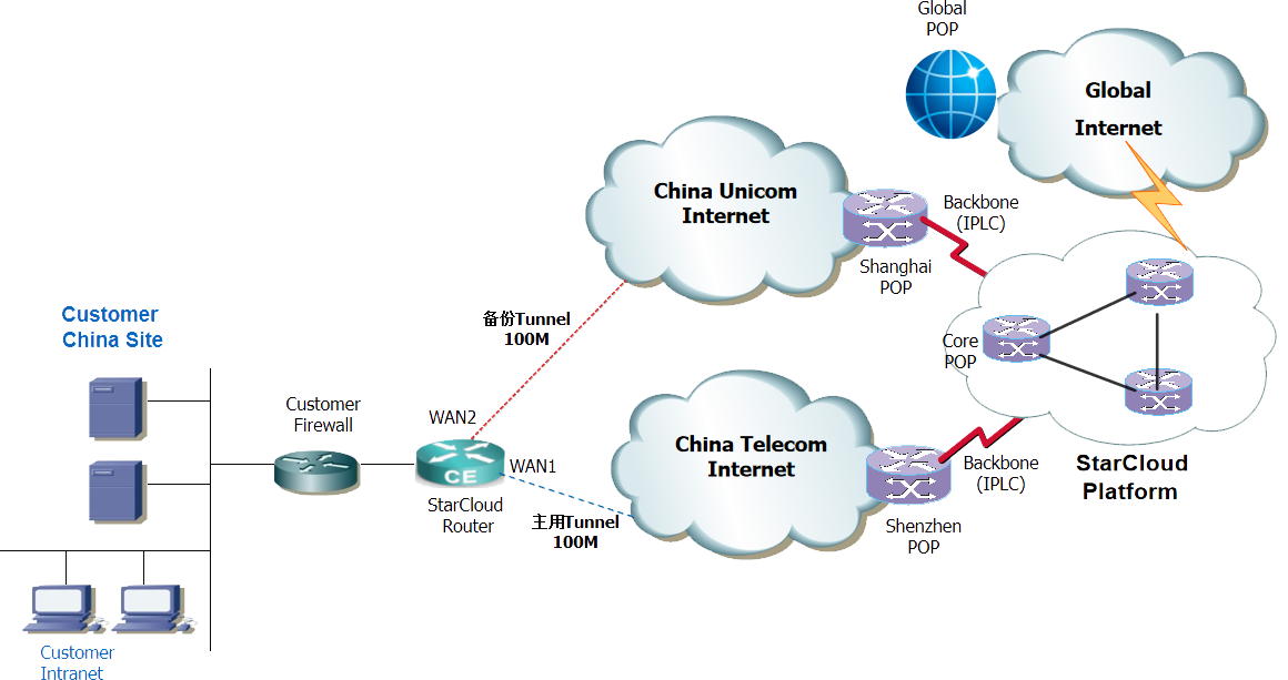 1、Customer Shanghai Site via Tunnel access StarCloud Shanghai POP.